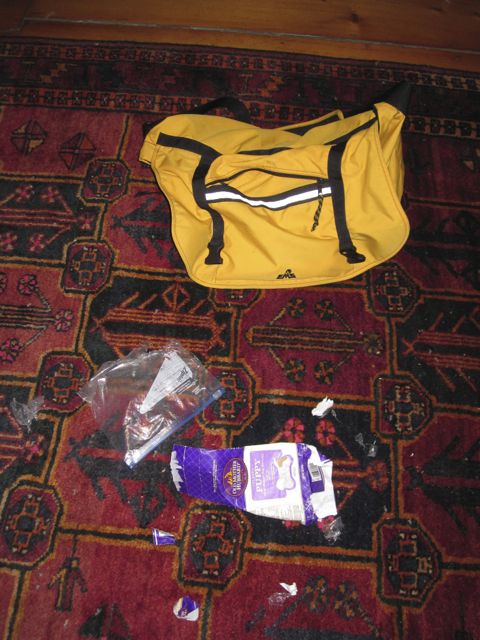 I had neglected, however, to empty the zippered pocket on the front flap of the bag. It contained a small clutch of Mother Hubbard puppy treats and a Ziploc bag of backup kibble. These bags now lay in shreds not far from the messenger pouch, whose zipper was fully unzipped.