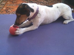 Lately, as soon as I motivate myself to do a little yoga, it’s been Rudy’s cue to grab something from the toy box and hunker down. A couple of times it’s gotten rambunctious, and I finally had to tell him to knock it off.