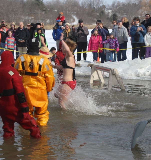 “Welcome to southern Vermont!” a voice blared over the loudspeaker. “Where else can you cut a hole in the ice and jump in?” Music thumped a pounding beat of encouragement and the crowd roared, caught up in the bare-it-all bravery.